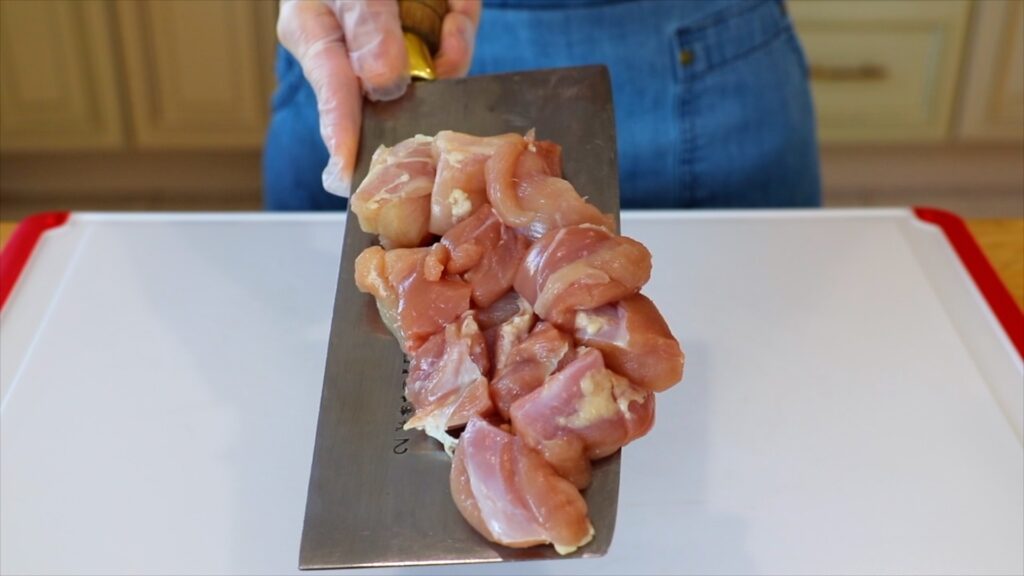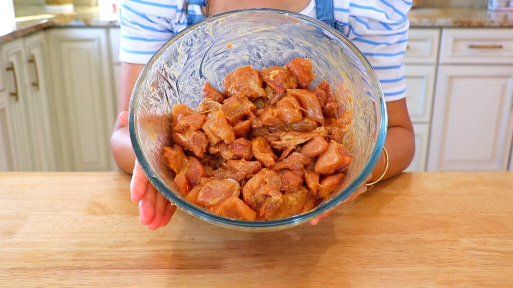 Cut chicken thighs into small, even pieces and place in a bowl.