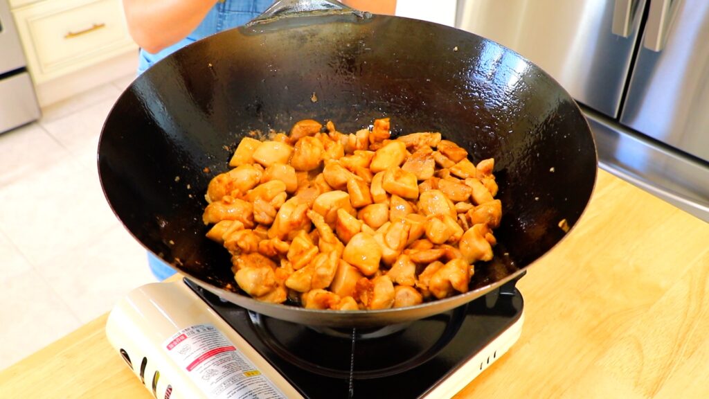 - To stir-fry the chicken, in a wok over high heat, add 1 tablespoon of cooking oil. Add the marinated chicken and stir-fry for about 3 minutes until fully cooked through. Remove and set aside.