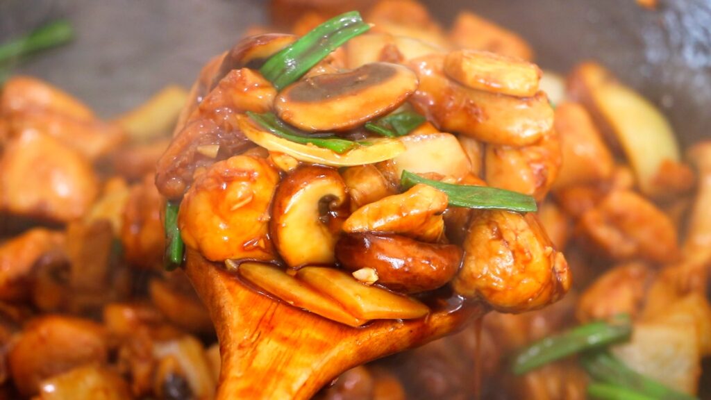 - To combine everything, return the chicken to the wok and pour in the sauce. Stir-fry until the sauce thickens and evenly coats the chicken and mushrooms. Lastly, add the scallions and give everything a quick toss before serving.