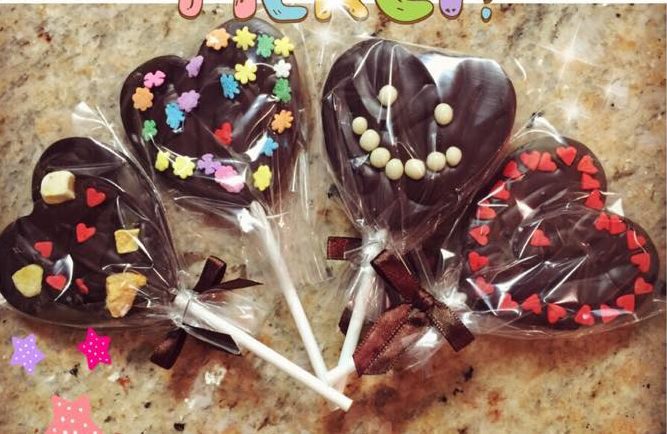 3. Decorate the molds with toppings. Then squeeze the bag from the top down to push the chocolate on to the molds. Fill every mold and then add the lollipop sticks. Transfer the chocolate molds into the fridge for 10 minutes. Your heart shaped lollipops will be ready in just 10 minutes!