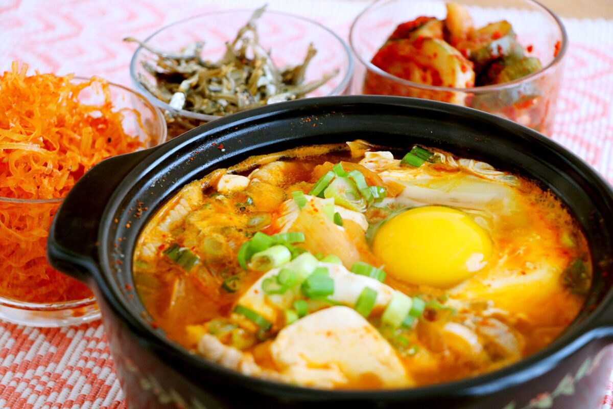 At this point, heat up a clay pot, and transfer the tofu stew into it. (The clay pot is going to make everything taste better, hotter, and maintain the temperature for longer.)