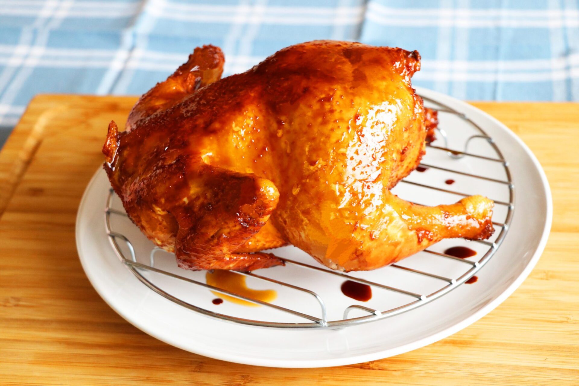 - Flip the chicken and continue basting with sauce for another 5 minutes. Repeat the process, flipping a few more times. Total cook time for a 3-pound chicken is about 25 minutes.